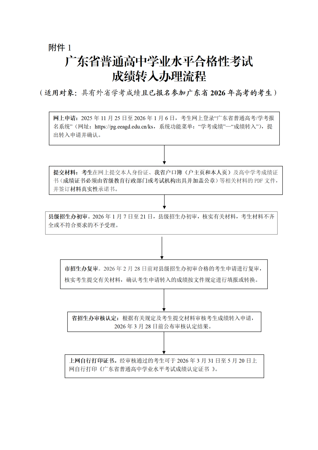 (五)省教育考试院审核。我院根据有关规定网上审核考生成绩转入申请,于2026年3月28日前在网上公布审核结果。考生可进入系统查询审核结果,经审核通过的考生可于3月31日至5月20日自行下载并打印“广东省普通高中学业水平考试成绩认定证书”。逾期系统关闭后将不能下载并打印证书,但不影响已转入成绩在招生录取中的使用。