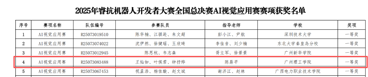 10月27日,2025年睿抗机器人开发者大赛全国总决赛完美收官。计算机科学与工程学院陈易平老师带队指导的王灿如、叶侯君、钟抒烨三位同学在AI视觉应用赛赛项中表现卓越、脱颖而出,荣获全国总决赛一等奖。