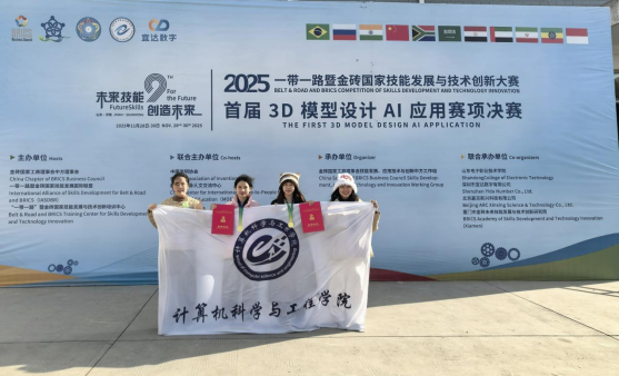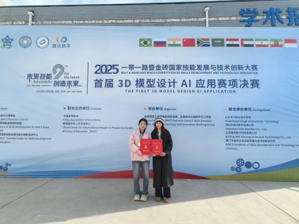 2025年度一带一路暨金砖国家技能发展与技术创新大赛之首届3D模型设计AI应用赛项线下决赛近日圆满收官!计算机科学与工程学院23级数字媒体技术专业6班蔡若彤、23级数字媒体技术4班张靖雯,凭借扎实的专业能力与创新思维,以大幅领先的成绩一举拿下本科组唯一一等奖。