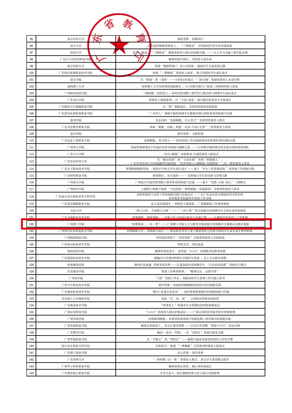 根据《广东省教育厅办公室关于报送学生资助工作典型材料的通知》,广东省教育厅在全省开展了学生资助工作典型学习宣传活动,经过学校遴选报送、省专家评审,确定广东省2025年度学生资助工作典型。