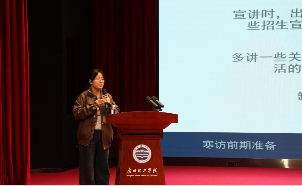 往年优秀寒访志愿者代表潘子桦登台分享实践经验。她从前期联络、宣传材料准备到现场互动、突发状况处理及后期反馈等方面进行了详细的经验分享,为今年参与寒访活动的志愿者们提供了详实可操作的范本。