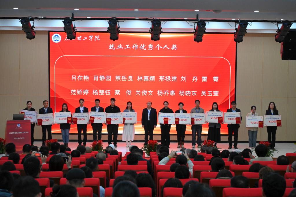 会议表彰了2025年招生与就业工作中表现突出的先进单位和先进个人。就业工作先进单位代表吕在艳、就业优秀个人代表林嘉颖、优秀班导师代表林慧、招生优秀代表李文权博士、学生代表林泓江依次发言并分享经验心得。