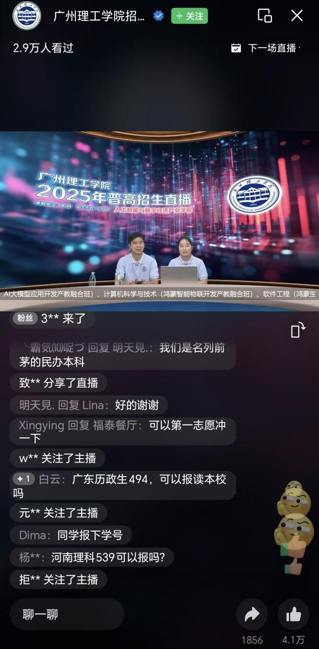 2025年,我校组织召开2025年招生直播动员会议。6月16日-26日,招生办联合十二大学院,策划推出“专业面对面”系列直播,特邀各学院院长、学科带头人、优秀在校生代表等近90人参与,内容涵盖专业特色、师资力量、就业数据、国际交流等多个方面,为考生提供了“一对一”精准指导。2025年6月普高招生直播期间,共组织19场直播,总观看人数突破19万人,互动留言超过3万条,显著提升了考生认知度和报考意愿。人工智能与数字经济产业学院作为25年新成立的学院,该学院高度重视专场直播,贺敏伟院长及主要班子成员齐齐上阵,并特邀科大讯飞高级讲师、网易产教融合总监、软通教育高级项目经理、360数字安全集团总监,介绍了以“三段式教学”为框架、以“项目化课程”为核心、以“系统性实践”为抓手、以“双导师机制”为支撑的教学理念,重点突出特色课程设置和人才培养方案。单场观看人数达3万余人,评论次数突破6000,是所有学院中活跃度最高的。25年该学院第一志愿录取了583人,并且一次性录满。
