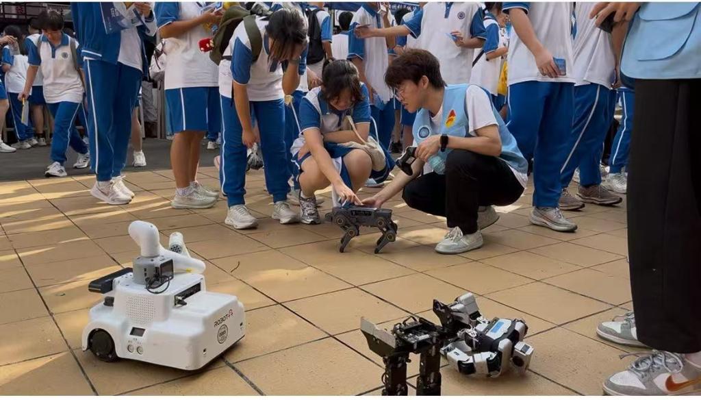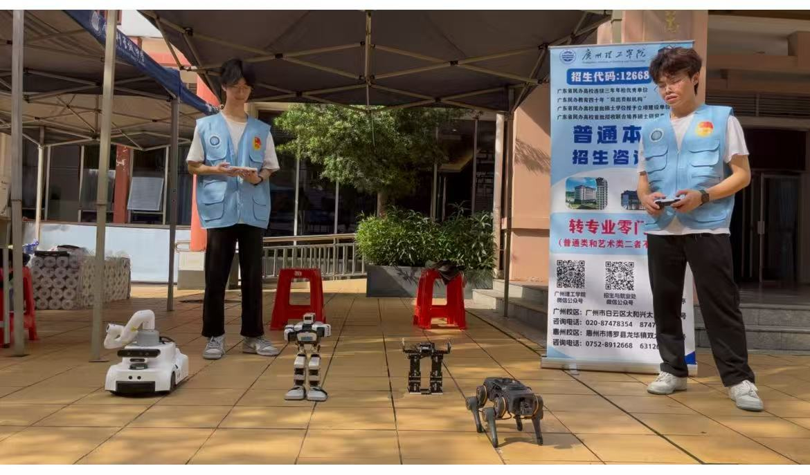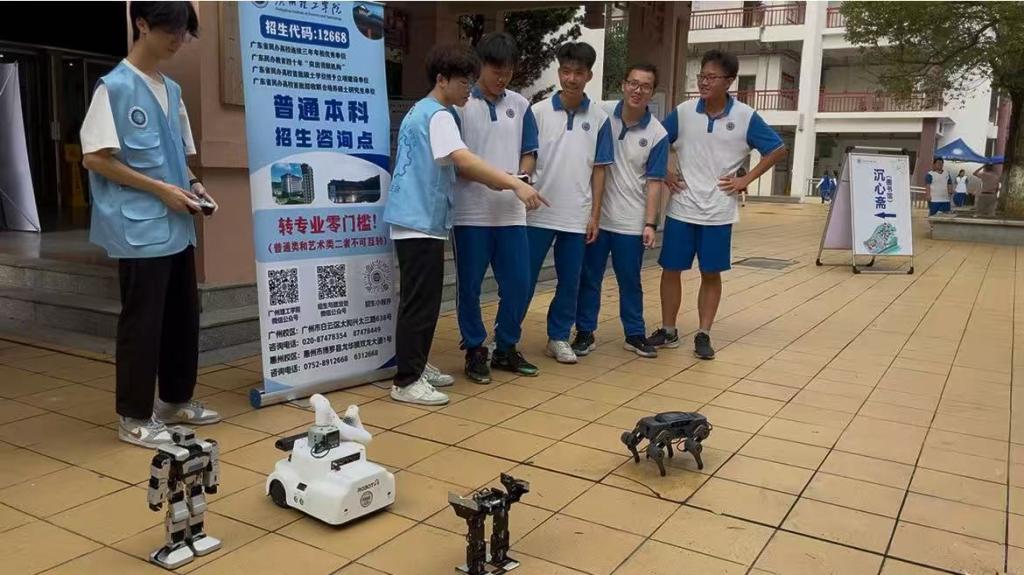 每年高考后,招生办都会组织“线下咨询会”,派出由招生骨干、专业教师、学生志愿者组成的宣讲团,奔赴重点生源地开展面对面咨询。2025年5月,我校招生办在广州科学城中学参加招生咨询会,现场吸引超过1000名考生和家长参与。咨询会现场,我校招生办特别设置“专业体验区”,由智能制造与电气工程学院学生现场演示U1机器狗、双足机器人、宇树Go2足式机器人等,让考生“零距离”感受我校教学特色。围观的高三生表示:“没想到招生咨询会还能这么‘接地气’,现场体验了机器人后,坚定了对工科的兴趣。”